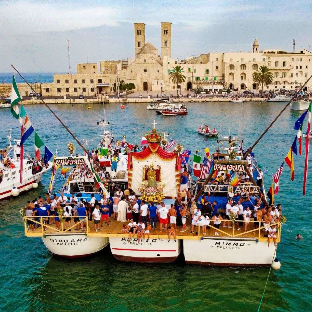 La Festa della Madonna dei Martiri, patrona di Molfetta e protettrice dei marinai, si celebra ogni anno tra la fine di agosto e l’inizio di settembre con una novena di preghiera, rievocazioni storiche e momenti di festa religiosa. Il culmine è l’8 settembre, quando la statua della Vergine, portata solennemente in processione, viene imbarcata per la tradizionale sagra a mare tra barche addobbate e fedeli radunati sul porto, in un connubio di fede, storia e identità comunitaria.