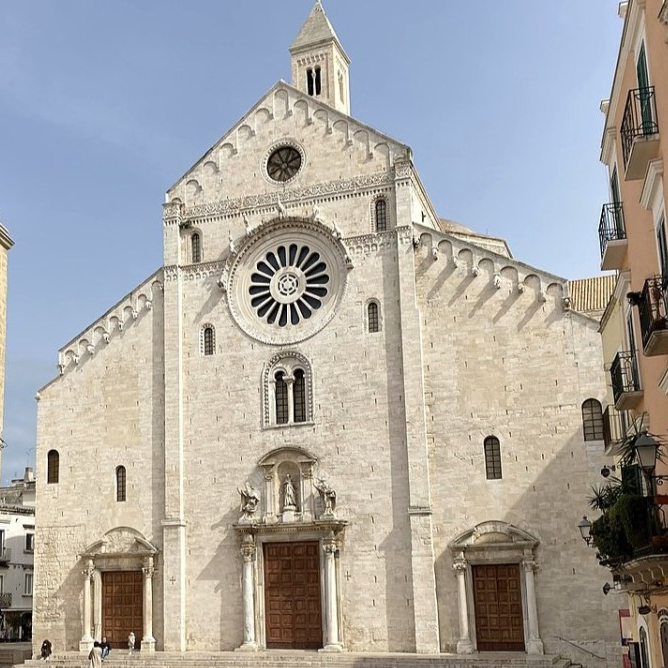 Una meravigliosa imponente chiesa sul mare, fu costruita usando la pietra di Trani, un tufo calcareo, estratto dalle cave della città, caratterizzato da un colore roseo chiarissimo, quasi bianco.